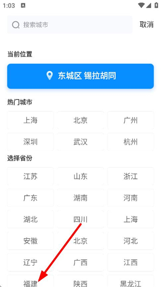 3、在城市選擇頁面,選擇想要查看天氣的城市,如福建相關城市。