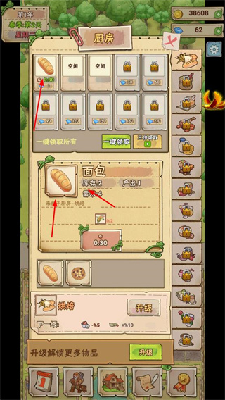 2、在廚房界面,利用農(nóng)作物原料制作食品,通過(guò)升級(jí)廚房設(shè)施提升生產(chǎn)效率和品類。