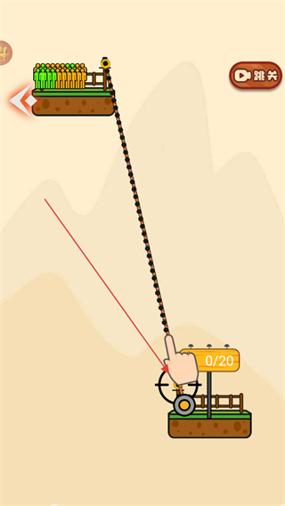 1、進(jìn)入關(guān)卡,看到屏幕下方有裝置,點(diǎn)擊裝置發(fā)射繩索,注意牌子上顯示的目標(biāo)數(shù)值,如0/20。