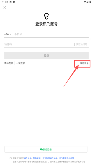 3、在登錄界面,點(diǎn)擊注冊賬號選項(xiàng),進(jìn)入注冊訊飛賬號頁面。