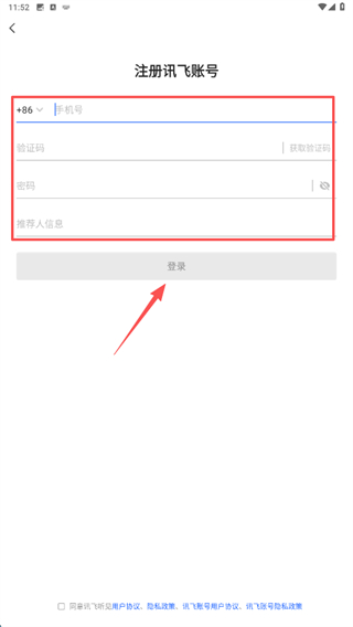 4、在注冊訊飛賬號頁面,依次輸入手機(jī)號碼、驗(yàn)證碼、密碼可選填推薦人信息,然后點(diǎn)擊登錄按鈕,完成賬號注冊操作。