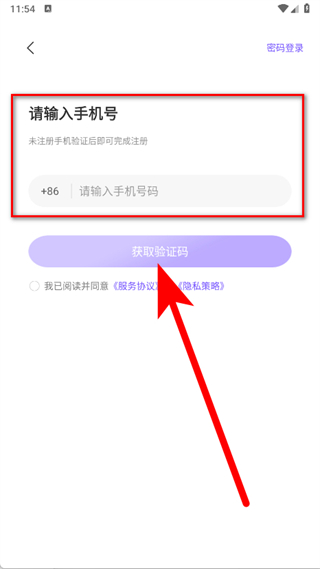 2、在登錄頁面輸入手機(jī)號碼,勾選同意后,點(diǎn)擊獲取驗(yàn)證碼。