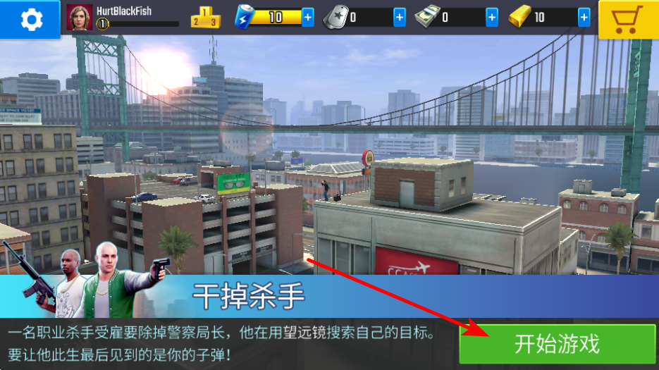 1、開始任務(wù)挑戰(zhàn),點(diǎn)擊開始游戲按鈕,進(jìn)入干掉殺手的任務(wù)場(chǎng)景,開啟狙擊任務(wù)的冒險(xiǎn)之旅。