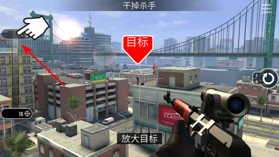 2、放大目標(biāo)視野,點(diǎn)擊放大按鈕,放大目標(biāo)區(qū)域,清晰觀察殺手的位置和狀態(tài),為精準(zhǔn)狙擊做好準(zhǔn)備。
