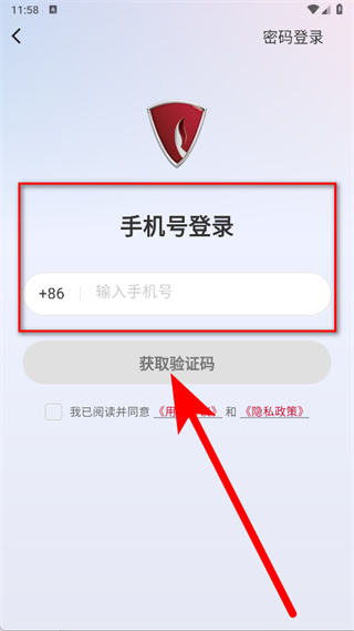 3、輸入手機(jī)號碼,勾選同意相關(guān)協(xié)議后,點(diǎn)擊獲取驗(yàn)證碼。