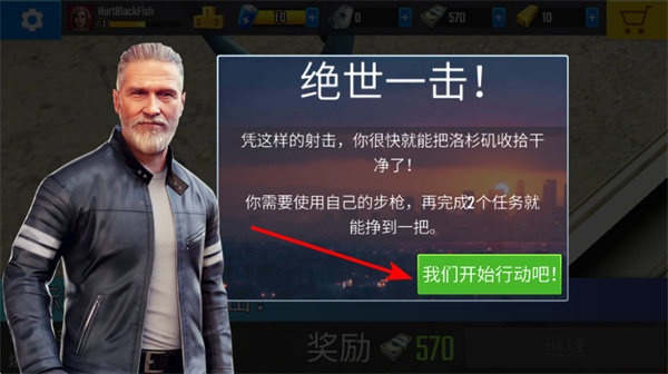 1、開(kāi)啟新的行動(dòng),點(diǎn)擊我們開(kāi)始行動(dòng)吧按鈕,進(jìn)入新的狙擊任務(wù)場(chǎng)景,繼續(xù)在洛杉磯的狙擊冒險(xiǎn),提升角色實(shí)力。