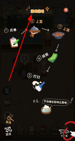 3、玩家可以查看游戲說明,了解點(diǎn)單、上菜、上鍋、結(jié)賬、打掃等流程,熟悉游戲玩法。