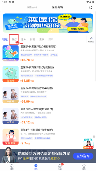 2、在保險(xiǎn)商城頁(yè)面,點(diǎn)擊醫(yī)療分類(lèi)標(biāo)簽,篩選醫(yī)療類(lèi)保險(xiǎn)產(chǎn)品。