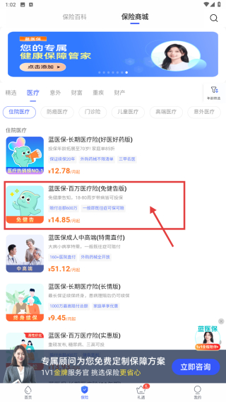 3、在醫(yī)療類(lèi)保險(xiǎn)產(chǎn)品列表中,選擇藍(lán)醫(yī)?!ぐ偃f(wàn)醫(yī)療險(xiǎn)免健告版產(chǎn)品,點(diǎn)擊進(jìn)入詳情頁(yè)。