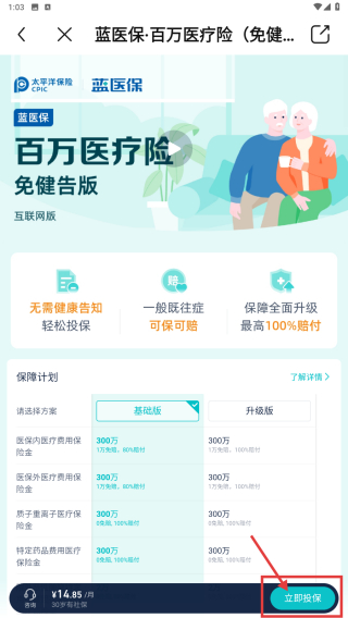 4、在產(chǎn)品詳情頁(yè),點(diǎn)擊立即投保按鈕,進(jìn)行該保險(xiǎn)產(chǎn)品的投保操作。