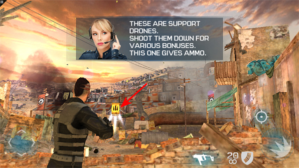 1、擊落支援無人機,根據(jù)提示,射擊支援無人機,獲取各種獎勵,補充戰(zhàn)斗資源,提升持續(xù)作戰(zhàn)能力。