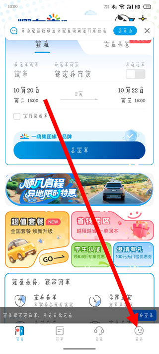 1、打開(kāi)耀東方租車,點(diǎn)擊底部導(dǎo)航欄最右側(cè)的我的。