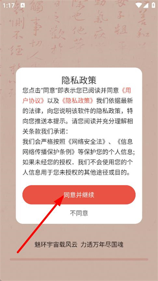1、在隱私政策彈窗中,點擊同意并繼續(xù),進入APP主頁面。