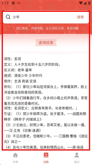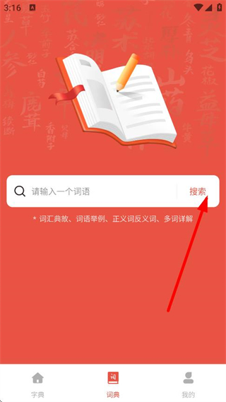 3、在詞典查詢頁面,輸入要查詢的詞語,點擊搜索,查看詞語解釋等內(nèi)容。