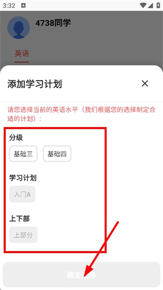 2、選擇英語水平等相關(guān)選項后,點擊確定選擇,添加學(xué)習(xí)計劃。