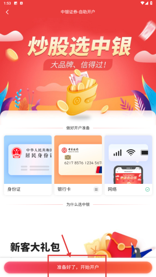 2、在個(gè)人中心頁(yè)面,點(diǎn)擊準(zhǔn)備好了,開始開戶按鈕,進(jìn)入開戶流程。