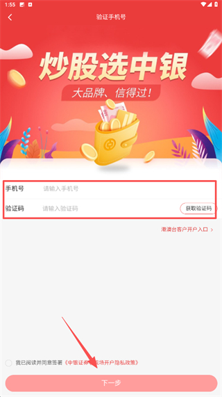 4、在驗(yàn)證手機(jī)號(hào)頁(yè)面,輸入手機(jī)號(hào)碼、獲取并輸入驗(yàn)證碼,勾選同意相關(guān)協(xié)議后,點(diǎn)擊下一步按鈕,繼續(xù)完成開戶操作。