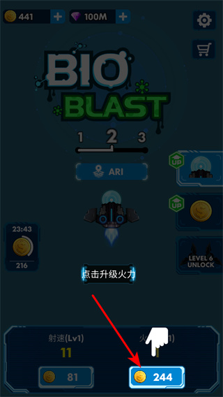 1、升級火力系統(tǒng),點(diǎn)擊升級火力按鈕,消耗金幣提升飛船的火力,增強(qiáng)對敵人的傷害輸出,優(yōu)化戰(zhàn)斗能力。