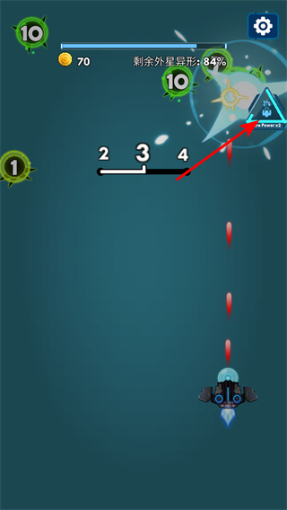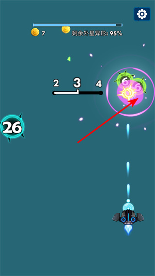 3、攻擊外星異形,瞄準(zhǔn)帶有數(shù)字標(biāo)識的外星異形如數(shù)字6的異形,降低其剩余比例,完成戰(zhàn)斗任務(wù),獲取獎勵。