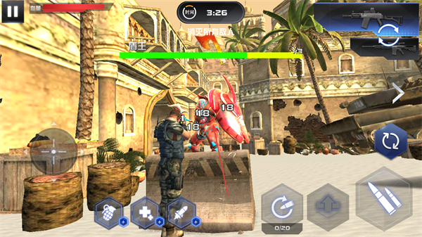 1、進入戰(zhàn)斗,遭遇敵人如紅色機甲怪物,通過左下方虛擬搖桿走位,利用掩體躲避攻擊。