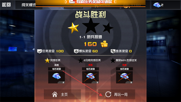 4、戰(zhàn)斗勝利后,查看獎勵如任務(wù)獎金,爆頭獎金等,點擊再玩一局可重新挑戰(zhàn)關(guān)卡。