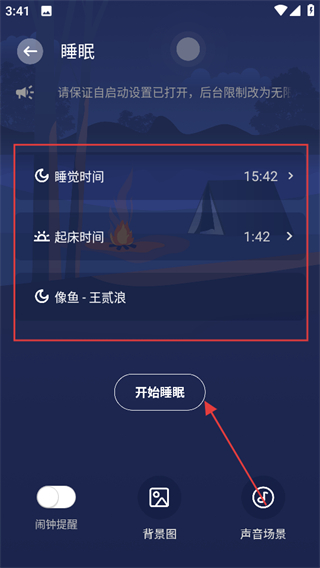 2、在睡眠設(shè)置頁(yè)面,設(shè)置好信息后,點(diǎn)擊開(kāi)始睡眠,進(jìn)入睡眠監(jiān)測(cè)頁(yè)面。