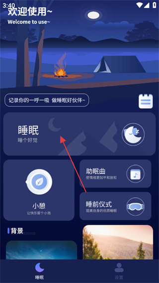 1、進(jìn)入幫助睡眠主頁(yè)面,點(diǎn)擊睡眠,進(jìn)入睡眠設(shè)置頁(yè)面。