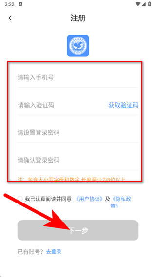 4、輸入手機(jī)號,點擊獲取驗證碼,填入收到的驗證碼等信息,勾選后,點擊下一步,完成注冊登錄。