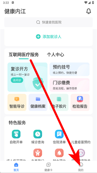 1、打開健康內(nèi)江,點擊底部導(dǎo)航欄最右側(cè)的我的。