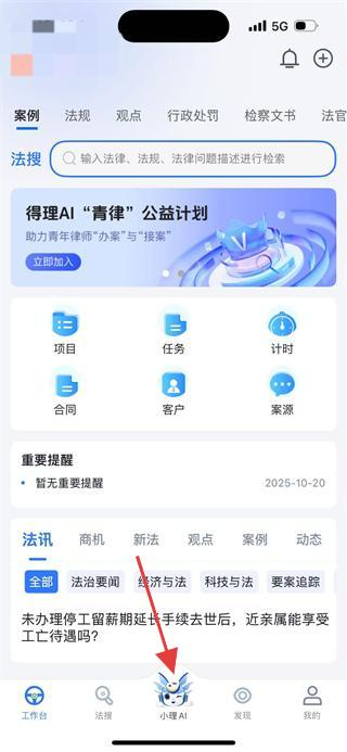 1、進(jìn)入得理法搜,在工作臺(tái)頁(yè)面點(diǎn)擊底部小理AI,進(jìn)入小理AI頁(yè)面。