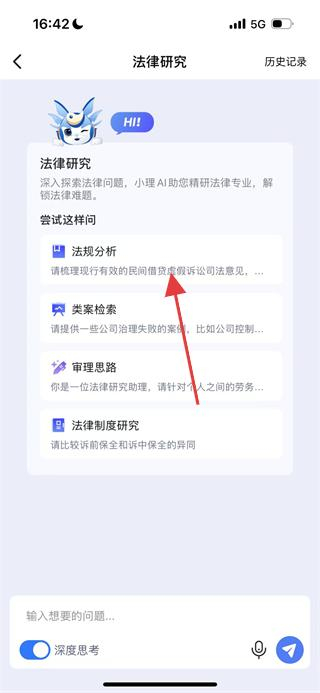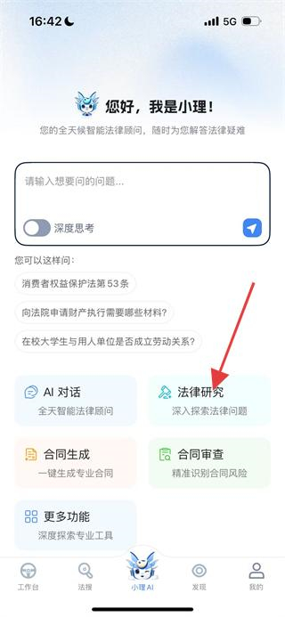 2、在小理AI頁(yè)面,點(diǎn)擊法律研究,進(jìn)入法律研究頁(yè)面。