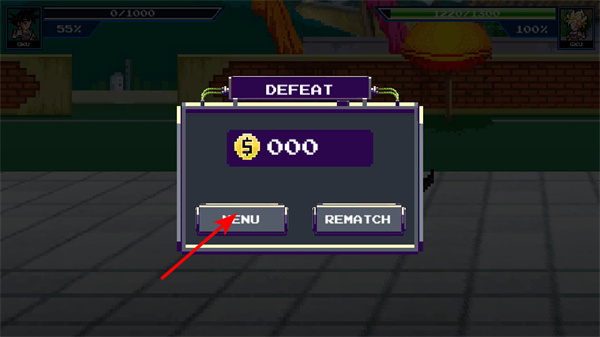 1、戰(zhàn)斗失敗后,點(diǎn)擊MENU按鍵,可返回游戲主菜單,在能選擇重新挑戰(zhàn)、更換角色進(jìn)行設(shè)置操作。