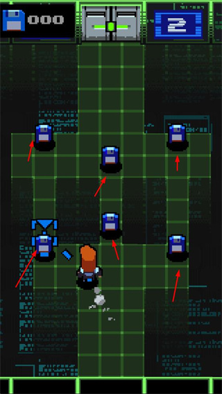 1、在網(wǎng)格地圖中收集藍(lán)色設(shè)備,獲取資源或解鎖新區(qū)域,同時(shí)躲避敵人。