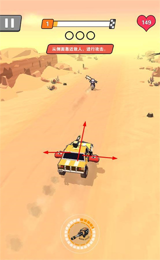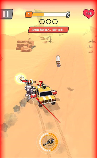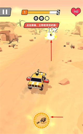 3、點(diǎn)擊屏幕使用武器攻擊敵人車輛,消滅敵人獲取分?jǐn)?shù)和獎(jiǎng)勵(lì)。