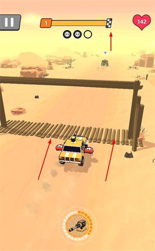 1、駕駛車輛在沙漠賽道行駛,穿越木橋等地形,朝著終點(diǎn)前進(jìn)。