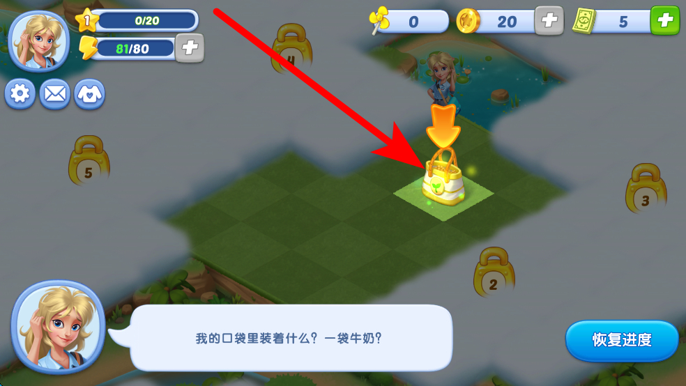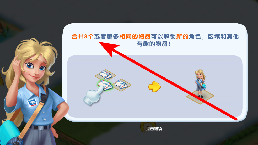 1、進入游戲后,會有提示合并3個或更多相同物品可解鎖新角色、區(qū)域等,按照指引,拖動相同物品進行合并,比如將牛奶瓶拖動到另外兩瓶上,合成新物品。