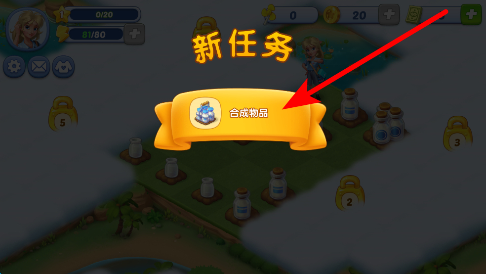 3、完成一個任務后,會出現新任務提示,比如合成物品,根據新任務要求,繼續(xù)進行物品合并,不斷推進島嶼的探索與發(fā)展,解鎖更多有趣的元素。