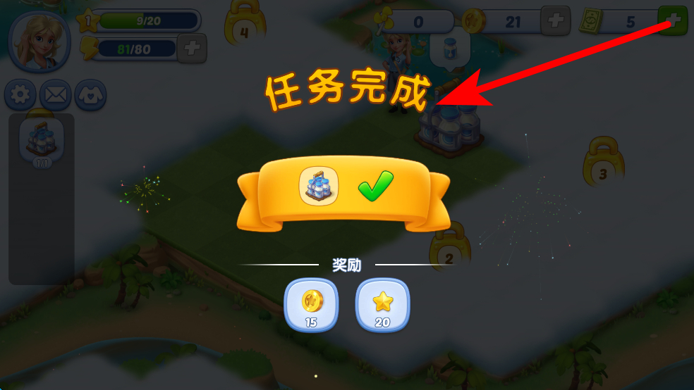 4、在合并物品過程中,會觸發(fā)任務,完成任務后會顯示任務完成,并獲得金幣、星星等獎勵,這些獎勵可用于后續(xù)解鎖新內容或助力合成操作。