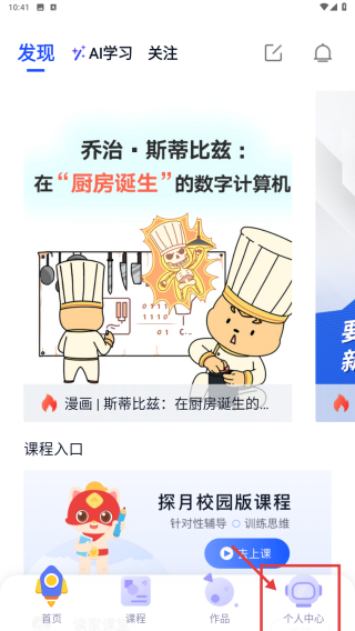 1、打開探月校園版應(yīng)用,點擊底部個人中心選項,進入個人中心頁面。