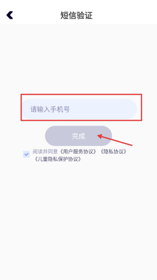 4、在短信驗證頁面,輸入手機號,勾選同意相關(guān)協(xié)議后,點擊完成按鈕,按照提示完成短信驗證,進而完成賬號登錄操作。