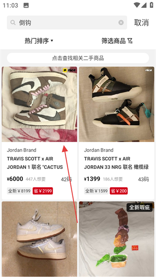 2、在二手商品頁面,點擊倒鉤,進入倒鉤商品列表頁面。