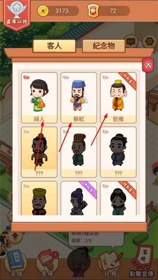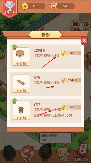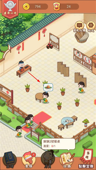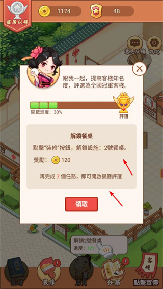 2、完成任務(wù)解鎖餐桌等設(shè)施,領(lǐng)取金幣獎勵,同時提升客棧的評遇等級。
