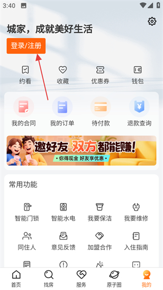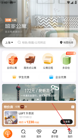 1、進入城家公寓首頁,點擊底部我的,進入個人頁面。