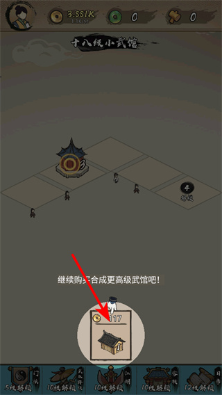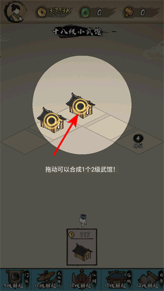 1、拖動(dòng)兩個(gè)相同的1級(jí)武館,可合成1個(gè)2級(jí)武館,合成更高級(jí)武館能提升金幣獲取速度。