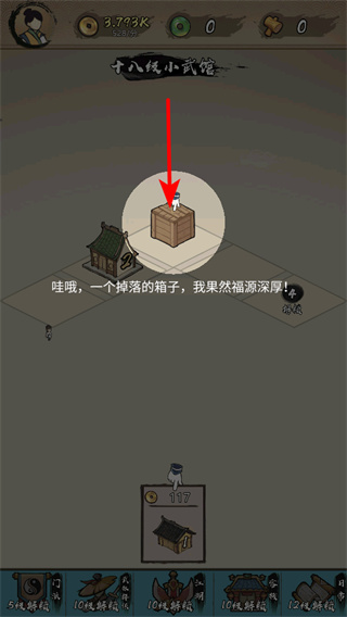 2、點(diǎn)擊掉落的箱子,可獲得獎(jiǎng)勵(lì),這些獎(jiǎng)勵(lì)能為武館建設(shè)或升級(jí)提供資源支持。