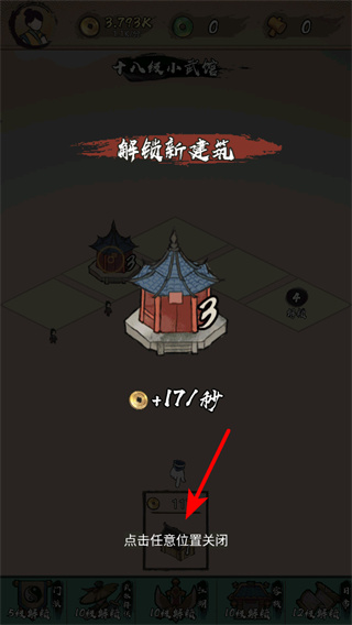 3、解鎖新建筑后,點(diǎn)擊任意位置可關(guān)閉提示界面,繼續(xù)進(jìn)行武館的建設(shè)與管理操作。