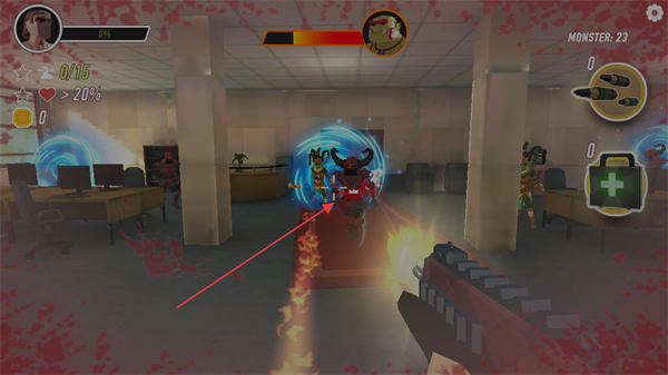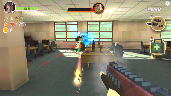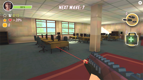 以辦公室為主要戰(zhàn)斗場景,還原辦公桌、文件柜、電梯等元素,僵尸會(huì)從走廊、會(huì)議室等不同區(qū)域出現(xiàn),場景代入感強(qiáng)烈。