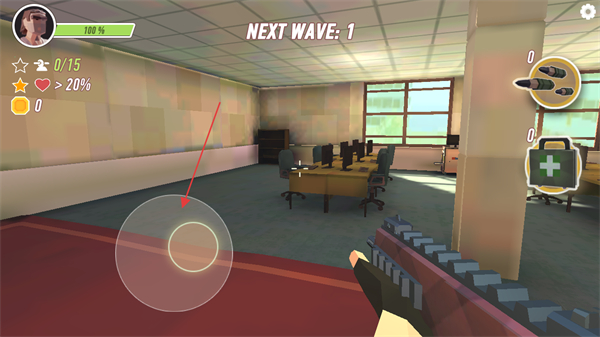 2、使用屏幕左下方的虛擬搖桿控制角色移動(dòng),在辦公室內(nèi)調(diào)整位置,做好迎戰(zhàn)準(zhǔn)備。