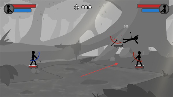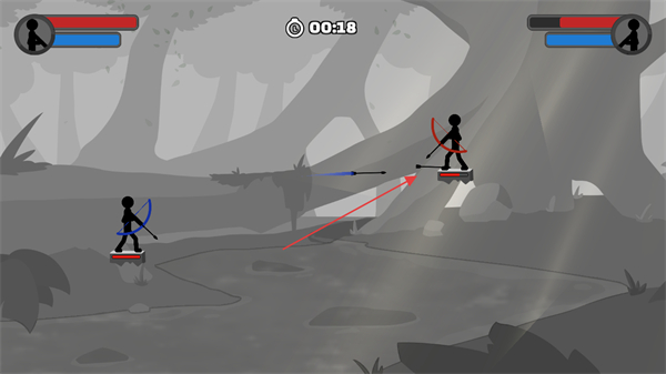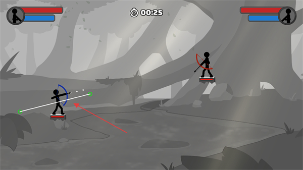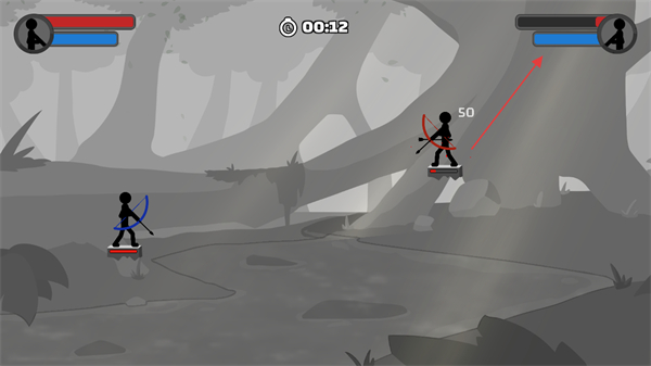 3、松開手指發(fā)射弓箭,攻擊敵方火柴人,注意觀察敵方血條變化。