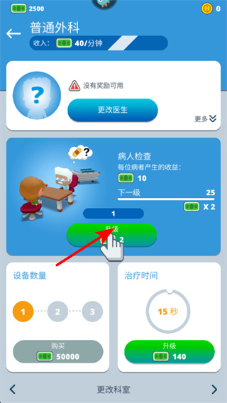4、在普通外科界面,點(diǎn)擊升級(jí)按鈕,可提升科室等級(jí),增加每位病者的收益,推動(dòng)發(fā)展。